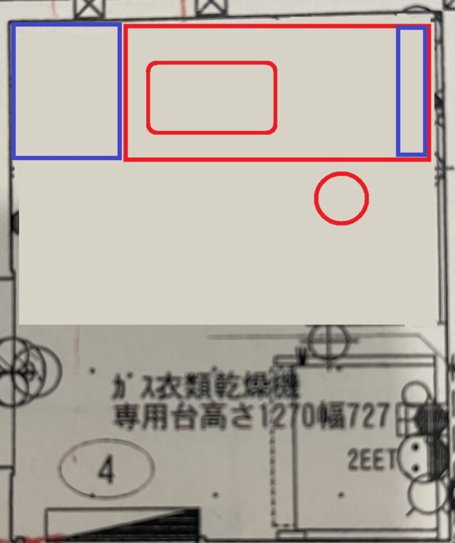 当初洗面化粧台の幅は1300mmに設定していましたが、乾太くん用のラックを置いたうえで洗濯機と一直線に納めようとすると洗面化粧台の幅を1200mmに縮める必要がありました